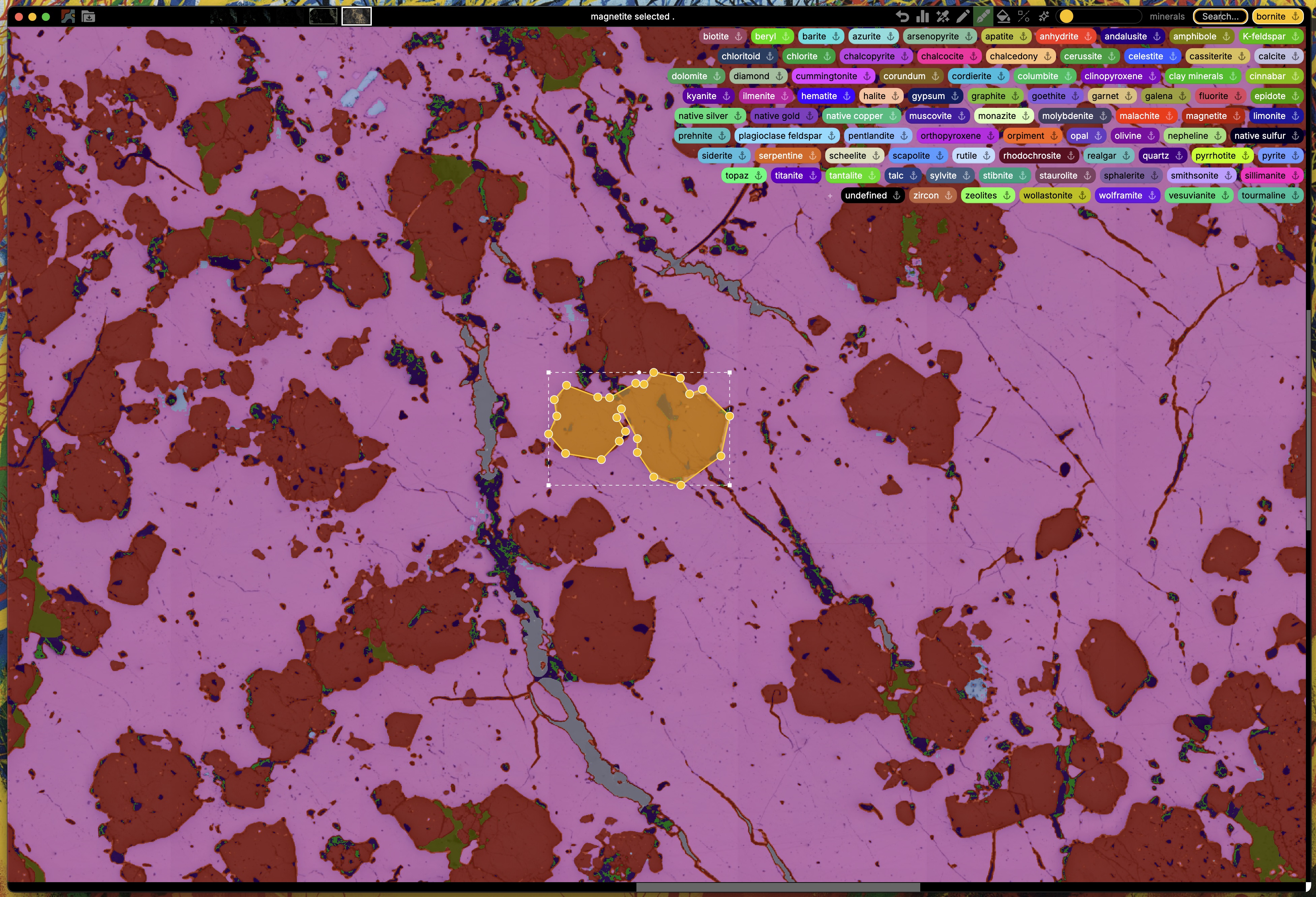 Precise determination of modal abundances for all mineral phases in the field of view. Full-scale classification of multi-channel thin section scans, pixel by pixel.